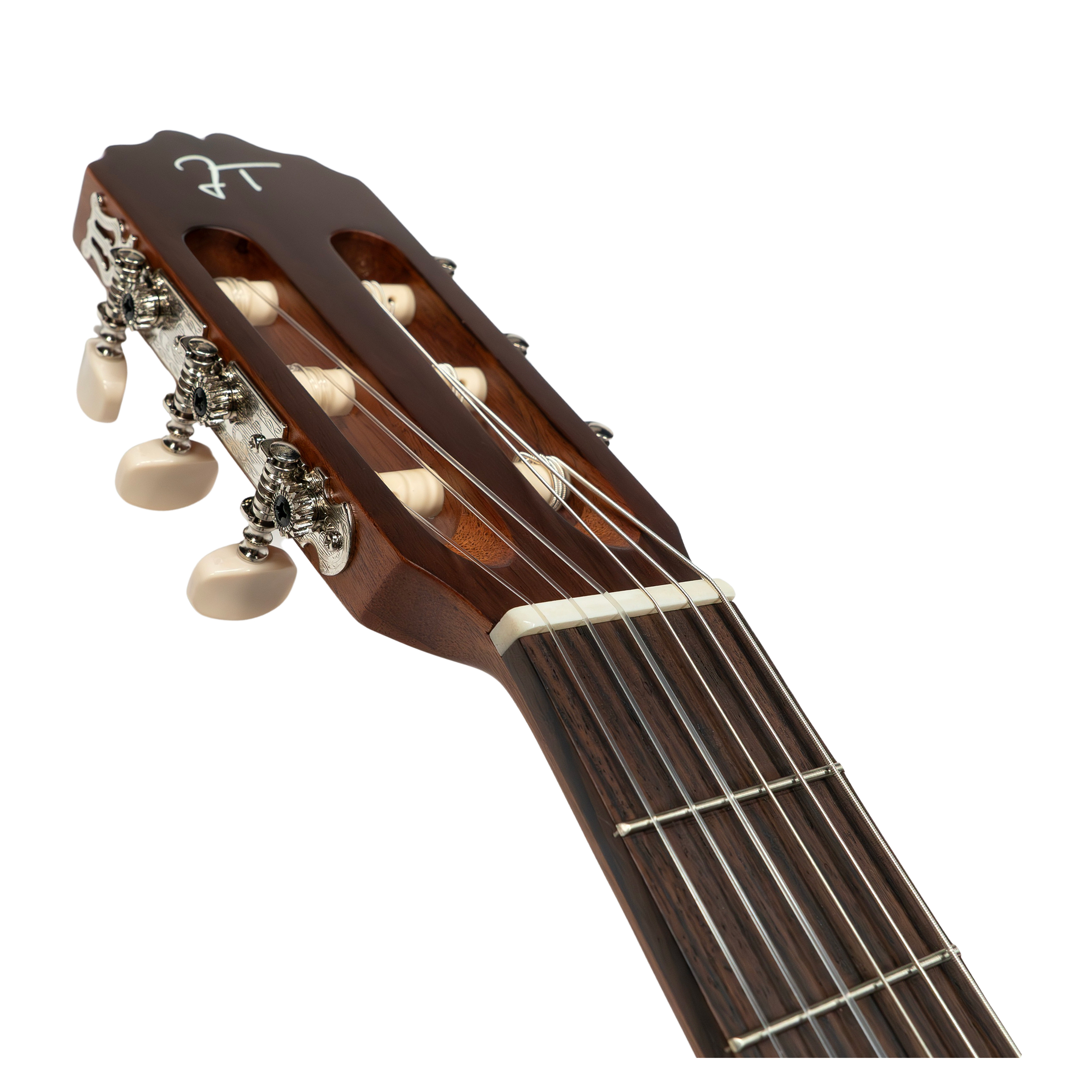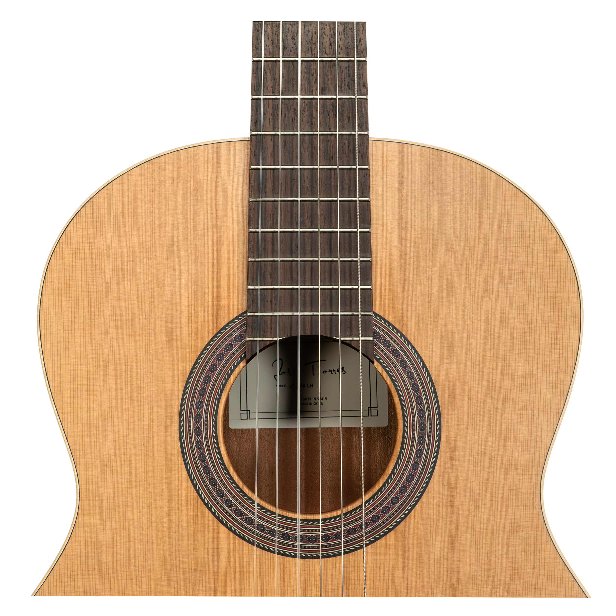 Chitarra classica. Modello per mancini. Piano in cedro massiccio. Fondo e fasce in mogano. Manico in mogano. Tastiera in palissandro indiano. Dado in osso 52mm. Paletta nichelata. Legatura in acero sul coperchio. Scala 650mm. Finitura opaca.